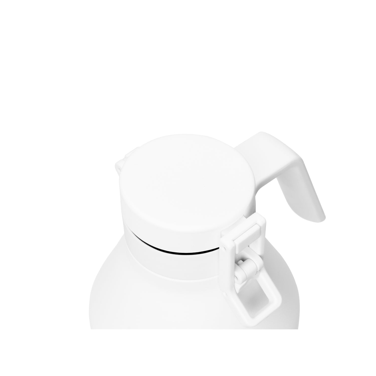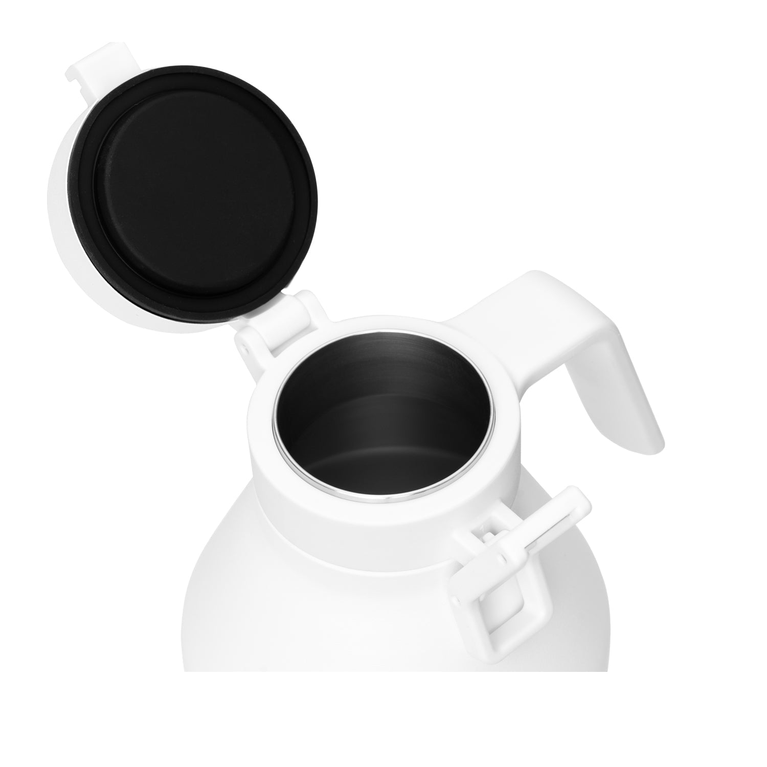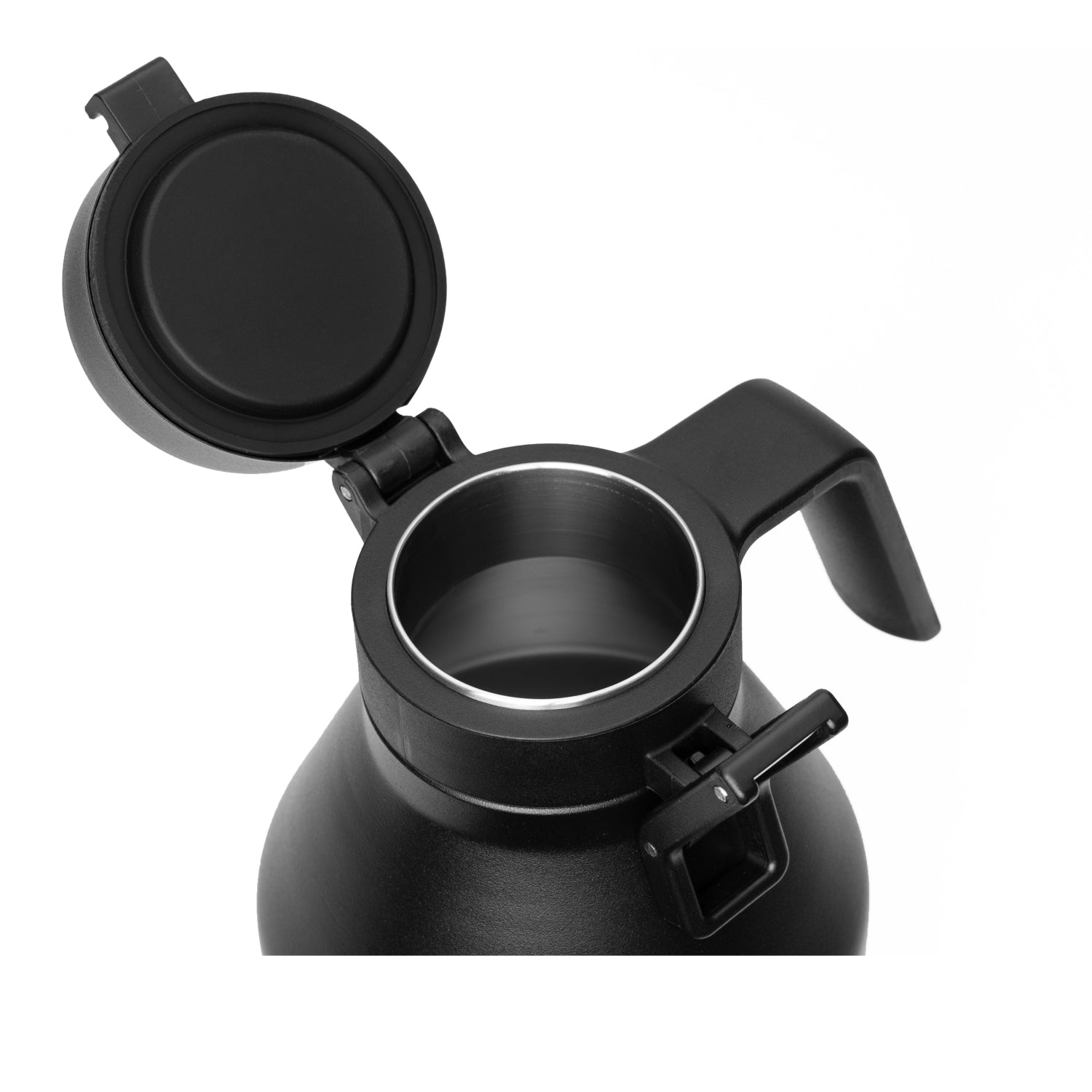 Intuitive hinge locks lid in an open position for easy pouring.